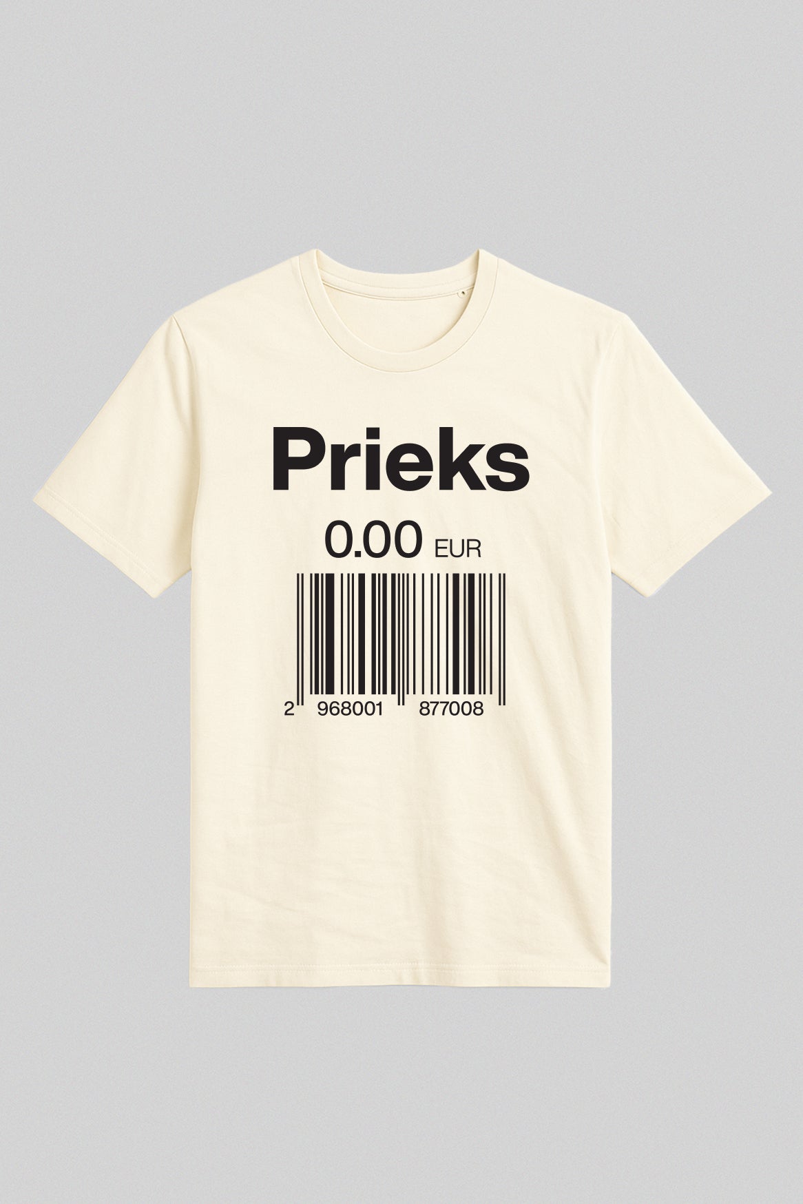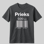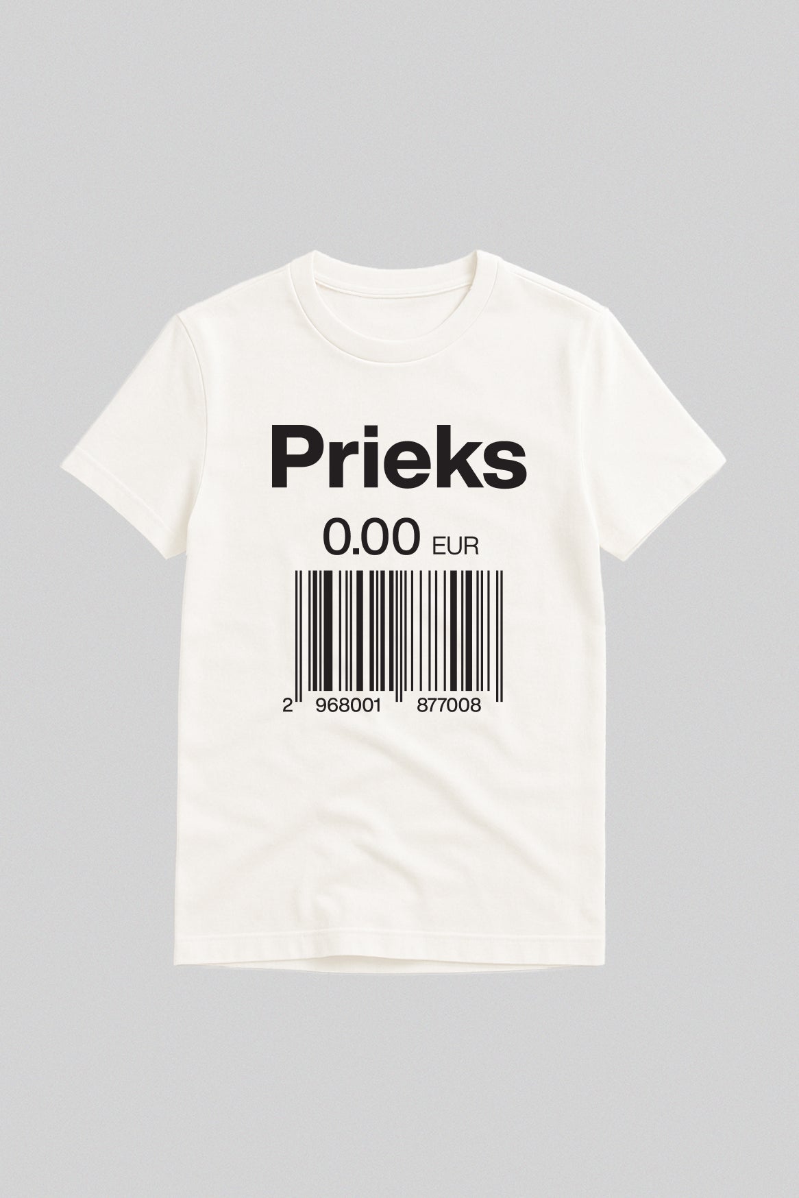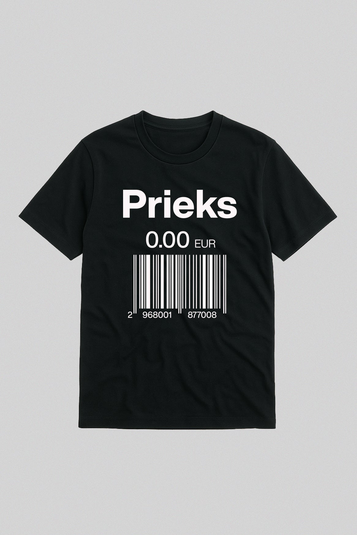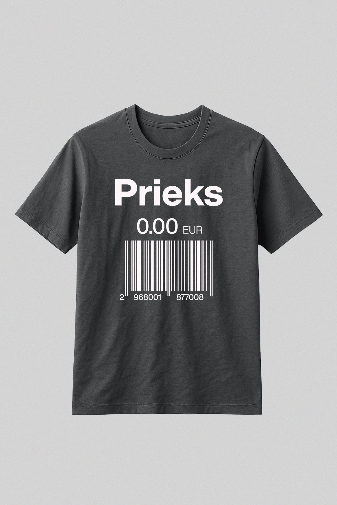 Kad Nikolā Appērs izgudroja konservus, viņš droši vien sapņoja par pasauli, kurā glabājas tikpat ilgi kā persiki sīrupā. Mēs šo utopiju sasniedzam – tikai bez metāla kārbām. Uz šī T-krekla lepni mirdz uzraksts “Prieks” , bet zem tā – cenrādis 0.00 EUR ar svītrkodu, tik simbolisks, ka pat skeneris pie kā nokaunas un atmet ar roku: “Šo nevar izsist, šis ir par brīvu.”